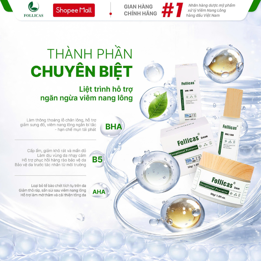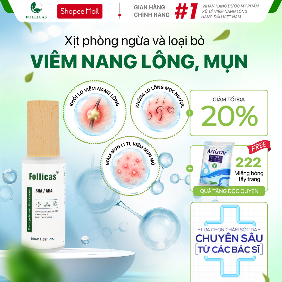 Xịt viêm nang lông Follicas 50ml giúp ngăn ngừa và xử lý tình trạng viêm nang lông, gây mụn tại nang lông, làm sạch da, thông thoáng lỗ chân lông với thành phần hoàn toàn từ thiên nhiên chiết xuất từ hạt phỉ, rau má, cúc La Mã, khổ qua.